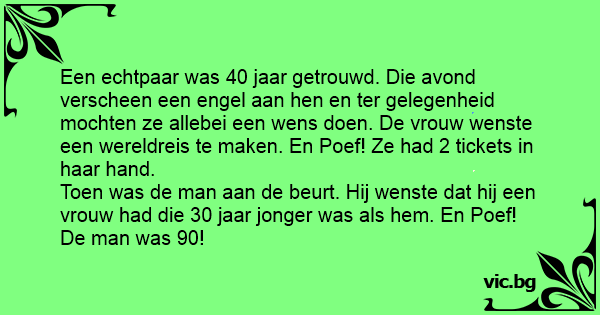 Een echtpaar was 40 jaar getrouwd. Die avond verscheen een engel aan hen en ter gelegenheid mochten ze allebei een wens doen. De vrouw wenste een wereldreis te maken. En Poef! Ze had 2 tickets in haar hand.