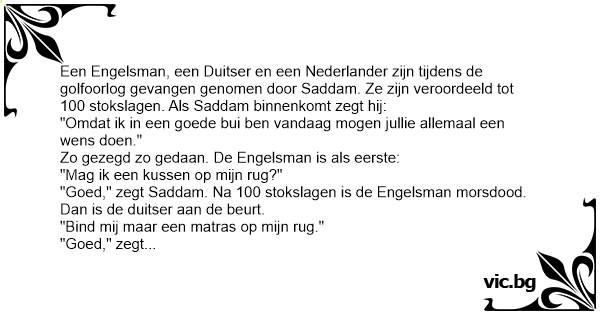 "Goed," zegt Saddam. Na 100 stokslagen is de Engelsman morsdood. Dan is de duitser aan de beurt.