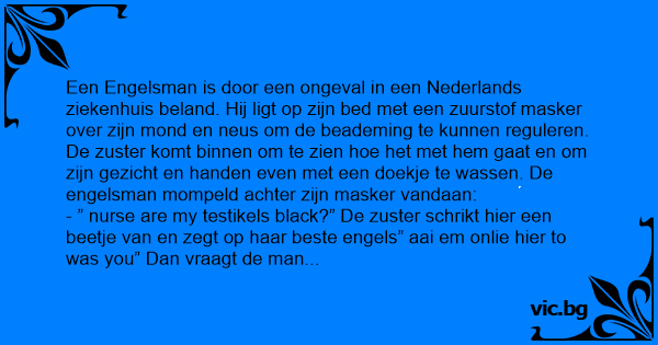 - ” nurse are my testikels black?” De zuster schrikt hier een beetje van en zegt op haar beste engels” aai em onlie hier to was you” Dan vraagt de man wederom ” nurse are my testikels black?” En weer antwoord de zuster dat zij hem alleen even de handen en het gezicht komt wassen.