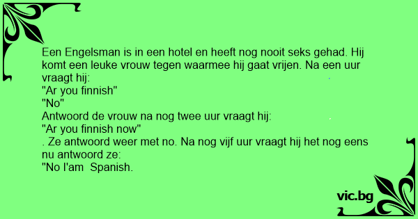 Een Engelsman is in een hotel en heeft nog nooit sекs gehad. Hij komt een leuke vrouw tegen waarmee hij gaat vrijen. Na een uur vraagt hij:
