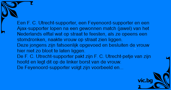Een F. C. Utrecht-supporter, een Feyenoord-supporter en een Ajax-supporter lopen na een gewonnen match (jawel) van het Nederlands elftal wat op straat te feesten, als ze opeens een stomdronken, naakte vrouw op straat zien liggen.