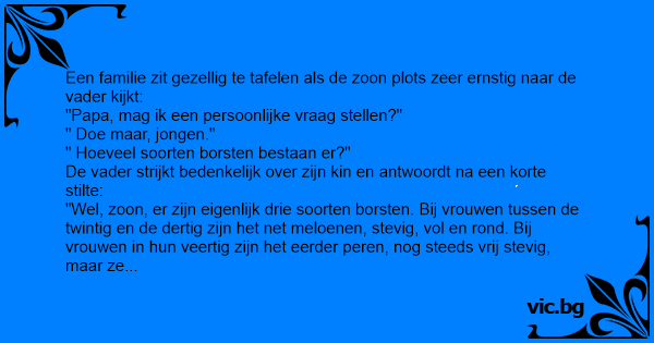 Een familie zit gezamenlijk aan tafel, plots vraagt de zoon aan zijn vader: “Papa, hoeveel soorten borsten zijn er?” De vader is door de vraag eerst even in de war, maar antwoordt dan: “Nou zoon,...