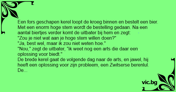 Een fors geschapen kerel loopt de kroeg binnen en bestelt een bier. Met een enorm hoge stem wordt de bestelling gedaan. Na een aantal biertjes verder komt de uitbater bij hem en zegt: