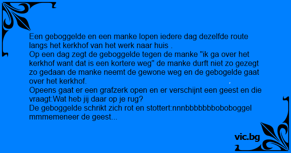 Op een dag zegt de geboggelde tegen de manke "ik ga over het kerkhof want dat is een kortere weg" de manke durft niet zo gezegt zo gedaan de manke neemt de gewone weg en de gebogelde gaat over het kerkhof.