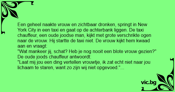 "Als je dan niet naar mijn borsten en mijn kont zit te staren, wat doe je dan?"Hij pauzeerde een ogenblik."Welnu vrouwtje, ik kijk en ik kijk nog eens, en dan denk ik bij mezelf, waar zou zij in godsnaam haar geld hebben gelaten om deze taxirit te betalen?"