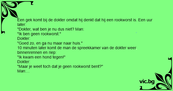 Een gek komt bij de dokter omdat hij denkt dat hij een rookworst is. Een uur later: