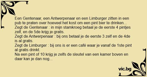 Een Gentenaar, een Antwerpenaar en een Limburger zitten in een pub te praten over hoeveel het kost om een pint bier te drinken...