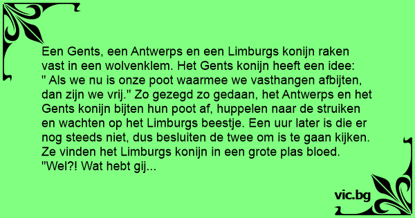" Als we nu is onze роот waarmee we vasthangen afbijten, dan zijn we vrij." Zo gezegd zo gedaan, het Antwerps en het Gents konijn bijten hun роот af, huppelen naar de struiken en wachten op het Limburgs beestje. Een uur later is die er nog steeds niet, dus besluiten de twee om is te gaan kijken. Ze vinden het Limburgs konijn in een grote plas bloed.