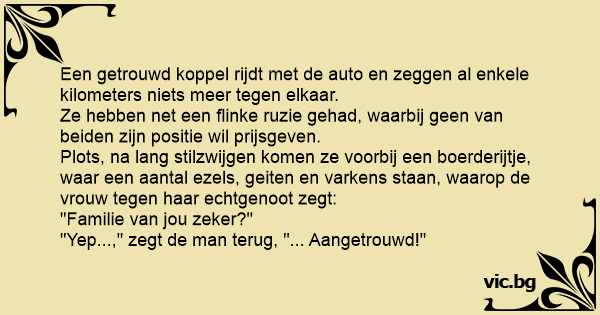 Een man krijgt tijdens een autorit ruzie met zijn vrouw. Ze rijden langs een weiland met een ezel. Zegt de man: "Familie van je?" De vrouw: "Nee, aangetrouwd!"