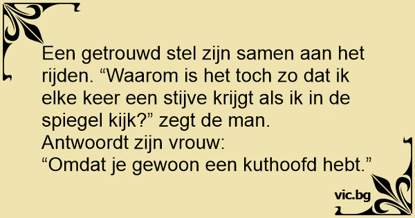 Een getrouwd stel zijn samen aan het rijden. “Waarom is het toch zo dat ik elke keer een stijve krijgt als ik in de spiegel kijk?” zegt de man.
