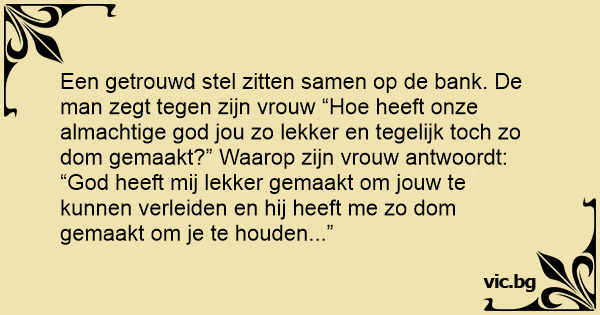 Een getrouwd stel zitten samen op de bank. De man zegt tegen zijn vrouw “Ное heeft onze almachtige god jou zo lekker en tegelijk toch zo dom gemaakt?” Waarop zijn vrouw antwoordt: