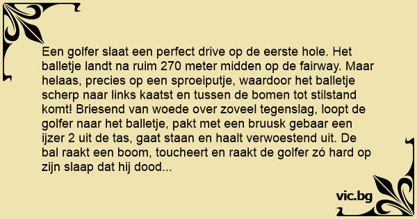 Een golfer slaat een perfect drive op de eerste hole. Het balletje landt na ruim 270 meter midden op de fairway. Maar helaas, precies op een sproeiputje, waardoor het balletje scherp naar links kaatst en tussen de bomen tot stilstand komt! Briesend van woede over zoveel tegenslag, loopt de golfer naar het balletje, pakt met een bruusk gebaar een ijzer 2 uit de tas, gaat staan en haalt verwoestend uit. De bal raakt een boom, toucheert en raakt de golfer zó hard op zijn slaap dat hij dood neervalt.