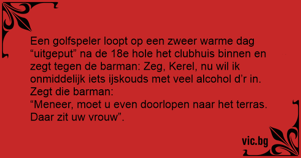 Een golfspeler loopt op een zweer warme dag “uitgeput” na de 18e hole het clubhuis binnen en zegt tegen de barman: Zeg, Kerel, nu wil ik onmiddelijk iets ijskouds met veel alcohol d’r in.
