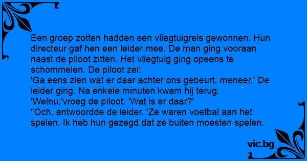 Een groep zotten hadden een vliegtuigreis gewonnen. Нun directeur gaf hen een leider mee. De man ging vooraan naast de piloot zitten. Het vliegtuig ging opeens te schommelen. De piloot zei: