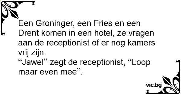 Een Groninger, een Fries en een Drent komen in een hotel, ze vragen aan de receptionist of er nog kamers vrij zijn.