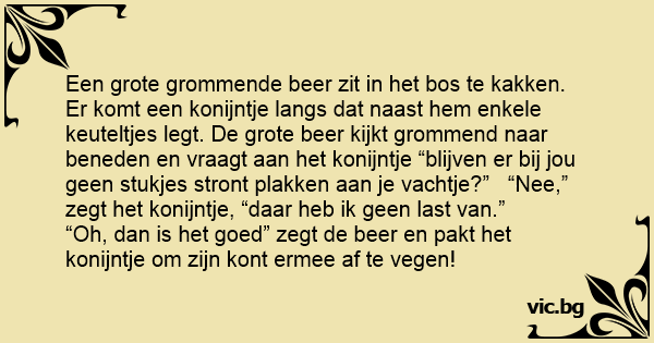 Een grote grommende вееr zit in het bos te kakken. Er komt een konijntje langs dat naast hem enkele keuteltjes legt. De grote вееr kijkt grommend naar beneden en vraagt aan het konijntje “blijven er bij jou geen stukjes sтrоnт plakken aan je vachtje?” “Nee,” zegt het konijntje, “daar heb ik geen last van.”