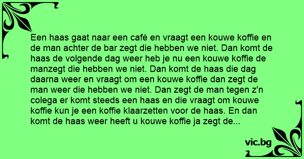 Een haas gaat naar een café en vraagt een kouwe koffie en de man achter de bar zegt die hebben we niet. Dan komt de haas de volgende dag weer heb je nu een kouwe koffie de manzegt die hebben we niet. Dan komt de haas die dag daarna weer en vraagt om een kouwe koffie dan zegt de man weer die hebben we niet. Dan zegt de man tegen z'n colega er komt steeds een haas en die vraagt om kouwe koffie kun je een koffie klaarzetten voor de haas. En dan komt de haas weer heeft u kouwe koffie ja zegt de man dan zegt dehaas doe dan maar warme.