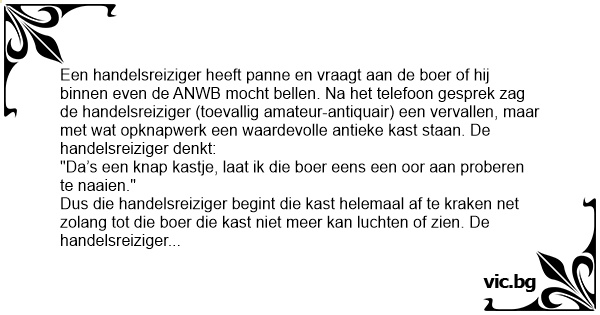 Een handelsreiziger heeft panne en vraagt aan de boer of hij binnen even de ANWB mocht bellen. Na het telefoon gesprek zag de handelsreiziger (toevallig amateur-antiquair) een vervallen, maar met wat opknapwerk een waardevolle antieke kast staan. De handelsreiziger denkt: