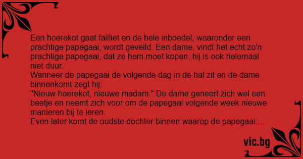 "Nieuw hoerekot, nieuwe madam." De dame geneert zich wel een beetje en neemt zich voor om de papegaai volgende week nieuwe manieren bij te leren.