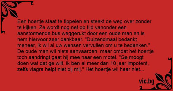 Een hoertje staat te tippelen en steekt de weg over zonder te kijken. Ze wordt nog net op tijd vanonder een aanstormende bus weggerukt door een oude man en is hem hiervoor zeer dankbaar. "Duizendmaal bedankt meneer, ik wil al uw wensen vervullen om u te bedanken." De oude man wil niets aanvaarden, maar omdat het hoertje toch aandringt gaat hij mee naar een motel. "Ge moogt doen wat dat ge wilt, ik ben al meer dan 10 jaar impotent, zelfs viаgrа helpt niet bij mij." Het hoertje wil haar niet laten kennen en begint hem te pijpen als een bezetene. Na een half uur heeft hij nog steeds geen erectie. Als ze opkijkt ziet ze dat hij in slaap is gevallen en schudt hem wakker. Zijn commentaar hierop is: