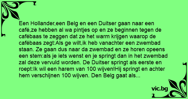 Een Hollander,een Belg en een Duitser gaan naar een café,ze hebben al wa pintjes op en ze beginnen tegen de cafébaas te zeggen dat ze het warm krijgen waarop de cafébaas zegt:Als ge wilt,ik heb vanachter een zwembad staan. Ze gaan dus naar da zwembad en ze horen opeens een stem:als je iets wenst en je springt dan in het zwembad zal deze vervuld worden. De Duitser springt als eerste en roept:Ik wil een harem van 100 wijven!Hij springt en achter hem verschijnen 100 wijven. Den Belg gaat als volgende en roept:Ik wil al het geld van de wereld hij springt,kijkt achter zich en ziet een berg van geld. Den Hollander neemt nen aanloop,glijdt uit en soept kijhard: SНIТ!!!!!!