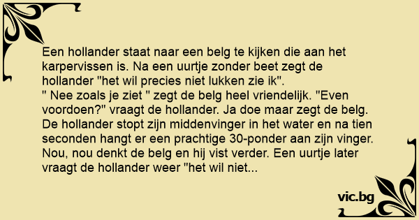 Een hollander staat naar een belg te kijken die aan het karpervissen is. Na een uurtje zonder beet zegt de hollander "het wil precies niet lukken zie ik".