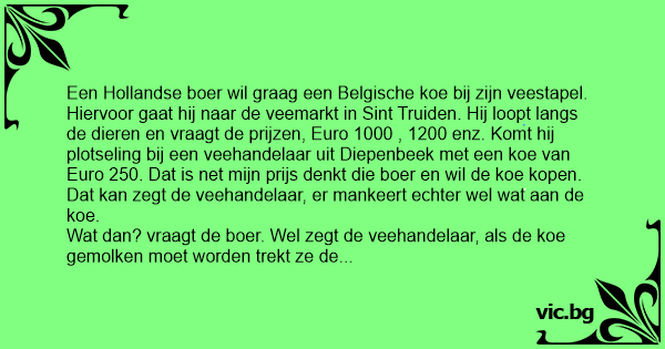 Een Hollandse boer wil graag een Belgische koe bij zijn veestapel. Hiervoor gaat hij naar de veemarkt in Sint Truiden. Hij loopt langs de dieren en vraagt de prijzen, Euro 1000 , 1200 enz. Komt hij plotseling bij een veehandelaar uit Diepenbeek met een koe van Euro 250. Dat is net mijn prijs denkt die boer en wil de koe kopen.