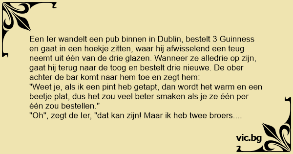 "Oh", zegt de Ier, "dat kan zijn! Maar ik heb twee broers. Eén zit in Amerika nu, en één in Austalië, en ik zit nu hier in Dublin. Toen we allemaal thuis vertrokken, hebben we elkaar beloofd dat we, eender waar we naartoe gingen, op deze manier zouden drinken, om de dagen dat we altijd samen op stap gingen te herdenken. Dus nu drink ik één voor mezelf en nog twee voor mijn twee broers..."