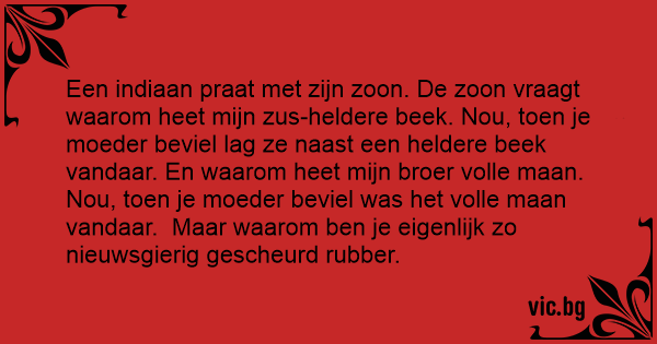Een indiaan praat met zijn zoon. De zoon vraagt waarom heet mijn zus-heldere beek. Nou, toen je moeder beviel lag ze naast een heldere beek vandaar. En waarom heet mijn broer volle maan. Nou, toen je moeder beviel was het volle maan vandaar. Maar waarom ben je eigenlijk zo nieuwsgierig gescheurd rubber.