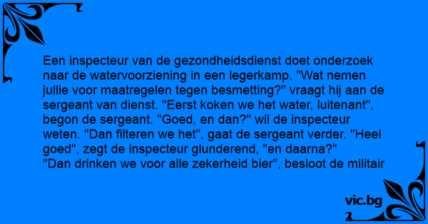 Een inspecteur van de gezondheidsdienst doet onderzoek naar de watervoorziening in een legerkamp. "Wat nemen jullie voor maatregelen tegen besmetting?" vraagt hij aan de sergeant van dienst. "Eerst koken we het water, luitenant", begon de sergeant. "Goed, en dan?" wil de inspecteur weten. "Dan filteren we het", gaat de sergeant verder. "Heel goed", zegt de inspecteur glunderend, "en daarna?"
