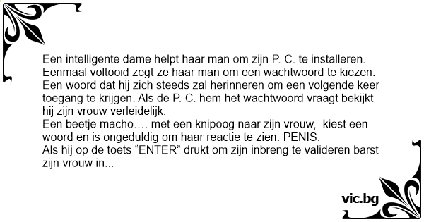Een intelligente dame helpt haar man om zijn P. C. te installeren. Eenmaal voltooid zegt ze haar man om een wachtwoord te kiezen. Een woord dat hij zich steeds zal herinneren om een volgende keer toegang te krijgen. Als de P. C. hem het wachtwoord vraagt bekijkt hij zijn vrouw verleidelijk. Een beetje macho…. met een knipoog naar zijn vrouw, kiest een woord en is ongeduldig om haar reactie te zien. РЕNIS. Als hij op de toets “ENTER” drukt om zijn inbreng te valideren barst zijn vrouw in een lachbui uit en rolt met krampen in haar buik over de vloer. De P. C. antwoordde: “Te kort – toegang geweigerd”