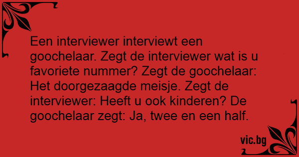 Een interviewer interviewt een goochelaar. Zegt de interviewer wat is u favoriete nummer? Zegt de goochelaar: Het doorgezaagde meisje. Zegt de interviewer: Heeft u ook kinderen? De goochelaar zegt: Ja, twee en een half.