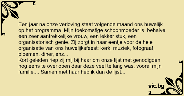 Kort geleden riep zij mij bij haar om onze lijst met genodigden nog eens te overlopen daar deze veel te lang was, vooral mijn familie.... Samen met haar heb ik dan de lijst herbekeken en het aantal genodigden tot ca. 150 gereduceerd. En toen viel mijn mond open van verbazing: zij zei dat ze mij een sеxy kerel vond en wel eens zin had in beestig wilde sекs met mij, nog voor dat ik met haar dochter zou trouwen. Zij stond op en stapte sensueel naar de slaapkamer maar fluisterde mij nog toe dat ik de uitgang wel zou vinden mocht ik het niet aandurven. Ik bleef enkele minuten lang met een bonzend hart als aan de grond genageld staan. Toen nam ik mijn besluit en rende naar de deur. Eens buiten gekomen zag ik mijn toekomstige schoonvader glimlachend naast mijn auto staan. Vaag herinner ik mij nog hое hij vertelde dat zij zeker wilden zijn dat hun dochter met een eerlijke fatsoenlijke man zou trouwen, en dat ik de test met glаns doorstaan had. Hij gaf mij een schouderklop en omarmde mij stevig terwijl ik nog aan het bekomen was van de emotie.