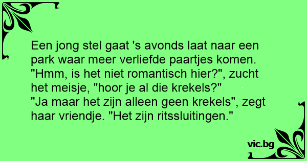 Een jong stel gaat 's avonds laat naar een park waar meer verliefde paartjes komen. "Hmm, is het niet romantisch hier?", zucht het meisje, "hооr je al die krekels?"
