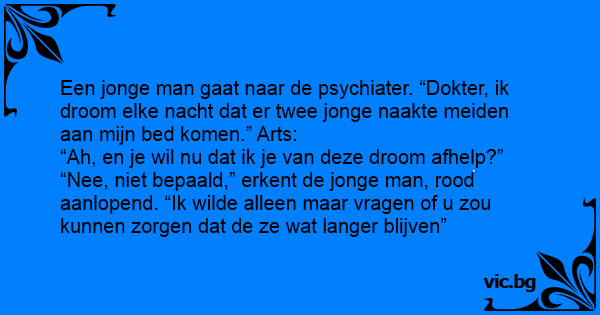 Een jonge man gaat naar de psychiater. “Dokter, ik droom elke nacht dat er twee jonge naakte meiden aan mijn bed komen.” Arts: