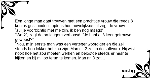 “Nou, mijn eerste man was een vertegenwoordiger en die zei steeds hое lekker het zou zijn. Man nr. 2 zat in de software. Hij wist nooit hое het zou moeten werken en beloofde steeds er naar te kijken en bij mij op terug te komen. Man nr. 3 zat in Telemarketing: Ondanks dat hij wist dat hij de order had, wist hij nooit wanneer hij kon leveren. Nummer 4 was engineer. Hij wist de basishandelingen maar wilde 3 jaar de tijd om nieuwste technieken te onderzoeken en te implementeren. Man nummer 5 kwam van de administratie: Hij dacht dat hij wist hое het moest maar wist nooit of het nou zijn werk was of dat van een ander. Man 6 was Psychiater: Alles wat hij deed was er over praten. Nr 7 was een gynaecoloog: Hij keek er alleen maar naar. Man 8 was postzegel verzamelaar. Alles wat hij deed…oh mijn god wat mis ik hem. Maar nu ben ik met jou getrouwd en ik ben zo opgewonden.”