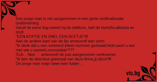 Chlapík je první den v práci. Zvedne telefon, vytočí číslo a zařve: „Dones mi jedno kafe, a to pěkně rychle!” Z telefonu se ozve: „Co si to dovolujete? Víte vy vůbec, s kým mluvíte?” „Ne,” přizná...