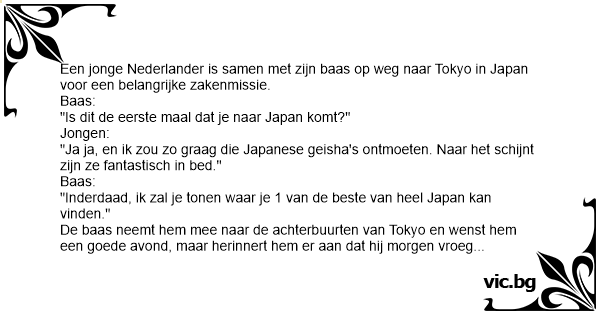 "Ja ja, en ik zou zo graag die Japanese geisha's ontmoeten. Naar het schijnt zijn ze fantastisch in bed."