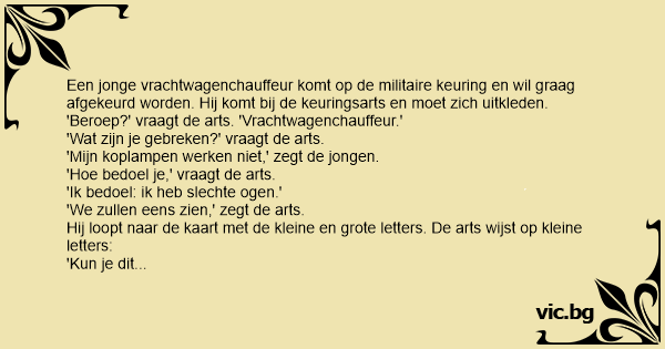 Een jonge vrachtwagenchauffeur komt op de militaire keuring en wil graag afgekeurd worden. Hij komt bij de keuringsarts en moet zich uitkleden.