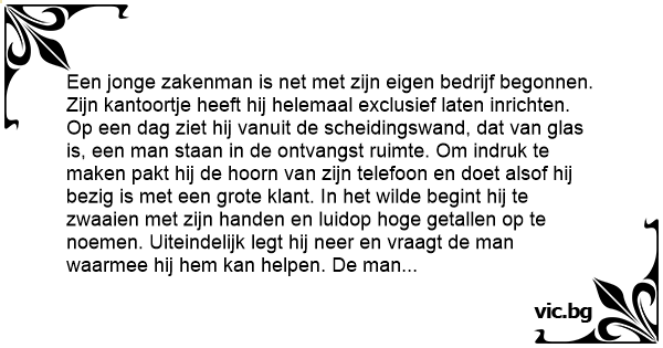 Een jonge zakenman is net met zijn eigen bedrijf begonnen. Zijn kantoortje heeft hij helemaal exclusief laten inrichten. Op een dag ziet hij vanuit de scheidingswand, dat van glas is, een man staan in de ontvangst ruimte. Om indruk te maken pakt hij de hoorn van zijn telefoon en doet alsof hij bezig is met een grote klant. In het wilde begint hij te zwaaien met zijn handen en luidop hoge getallen op te noemen. Uiteindelijk legt hij neer en vraagt de man waarmee hij hem kan helpen. De man antwoord: