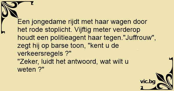 Een jongedame rijdt met haar wagen door het rode stoplicht. Vijftig meter verderop houdt een politieagent haar tegen."Juffrouw", zegt hij op barse toon, "kent u de verkeersregels ?"