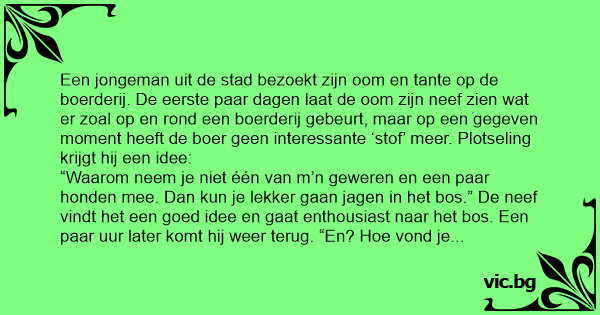 “Waarom neem je niet één van m’n geweren en een paar honden mee. Dan kun je lekker gaan jagen in het bos.” De neef vindt het een goed idee en gaat enthousiast naar het bos. Een paar uur later komt hij weer terug. “En? Ное vond je het?” vraagt de boer. “Geweldig!” antwoordt de neef, “hebben jullie nog meer honden?”