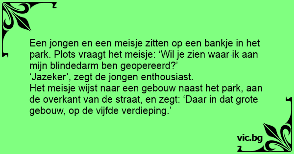 Een jongen en een meisje zitten op een bankje in het park. Plots vraagt het meisje: ‘Wil je zien waar ik aan mijn blindedarm ben geopereerd?’
