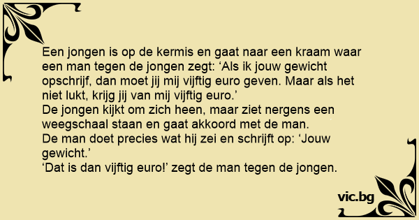 Een jongen is op de kermis en gaat naar een kraam waar een man tegen de jongen zegt: ‘Als ik jouw gewicht opschrijf, dan moet jij mij vijftig euro geven. Maar als het niet lukt, krijg jij van mij vijftig euro.’