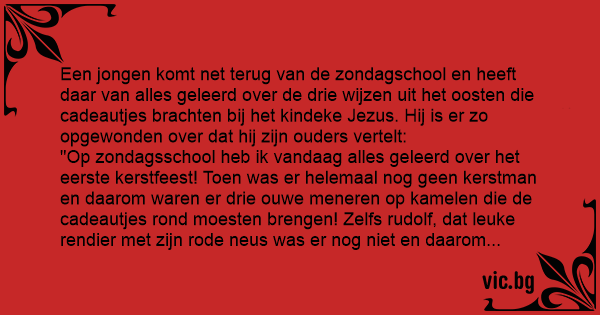 "Op zondagsschool heb ik vandaag alles geleerd over het eerste kerstfeest! Toen was er helemaal nog geen kerstman en daarom waren er drie ouwe meneren op kamelen die de cadeautjes rond moesten brengen! Zelfs rudolf, dat leuke rendier met zijn rode neus was er nog niet en daarom hadden ze een grote ster aan de hemel zodat ze de weg niet kwijt konden raken!"