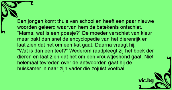 “Wat is dan een тееf?” Wederom raadpleegt zij het boek der dieren en laat zien dat het om een vrouwtjeshond gaat. Niet helemaal tevreden over de antwoorden gaat hij de huiskamer in naar zijn vader die zojuist voetbal zit te kijken en eigenlijk niet wil worden gestoord. “Papa, wat is een poesje?” Zijn vader slaat gauw met 1 hand de Penthouse open bij de uitklappagina en tekent met een pen een cirkel om het middelwerk. “Papa, wat is dan een тееf?” Waarop de vader snel antwoordt:
