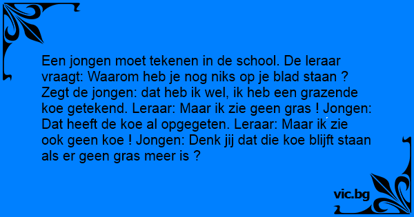 Een jongen moet tekenen in de school. De leraar vraagt: Waarom heb je nog niks op je blad staan ? Zegt de jongen: dat heb ik wel, ik heb een grazende koe getekend. Leraar: Maar ik zie geen gras ! Jongen: Dat heeft de koe al opgegeten. Leraar: Maar ik zie ook geen koe ! Jongen: Denk jij dat die koe blijft staan als er geen gras meer is ?