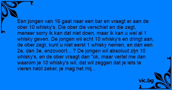 Komt een man een bar binnen. De barman vraagt wat hij wilt drinken. Zegt de man: 'Doe maar 7 glaasjes Whiskey' Barman: 'Vier je soms iets?' Zegt de man: 'Ja, mijn eerste pijpbeurt!' 'O' zegt de...