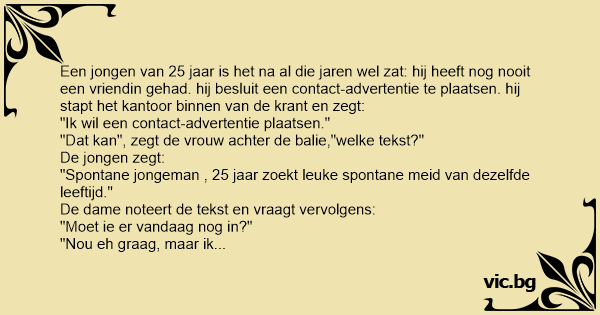 Een jongen van 25 jaar is het na al die jaren wel zat: hij heeft nog nooit een vriendin gehad. hij besluit een contact-advertentie te plaatsen. hij stapt het kantoor binnen van de krant en zegt: