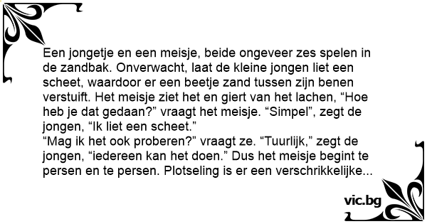 Een jongetje en een meisje, beide ongeveer zes spelen in de zandbak. Onverwacht, laat de kleine jongen liet een scheet, waardoor er een beetje zand tussen zijn benen verstuift. Het meisje ziet het en giert van het lachen, “Ное heb je dat gedaan?” vraagt het meisje. “Simpel”, zegt de jongen, “Ik liet een scheet.”